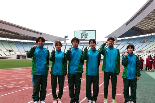第6回全国大学対校男女混合駅伝が2月15日(日)、オープンの関西学連選抜を含む22チームが参加し大阪市のヤンマースタジアム長居及び長居公園内特設コースで行われ本学陸上競技部が出場。4大会連続の出場となった今回は、序盤からハイペースとなったことなどもあり21位と出遅れます。しかし、何とか食らいつき、前との差を徐々に縮めるとアンカーの古西亜海選手(鍼灸学科4年)が区間8位の力走で3人をかわし過去最高となる17位でフィニッシュ。総合でも前回から2分近くタイムを縮めるなどチーム力が光りました。応援ありがとうございました。