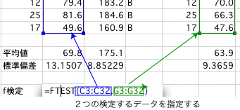 FTEST関数は、”FTEST(データ列A, データ列B)”と用います。データ列AはA群のデータ、データ列BはB群のデータです。openofficeでは、”FTEST(データ列A; データ列B)”と仕切りが”;”になります。