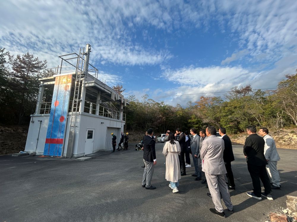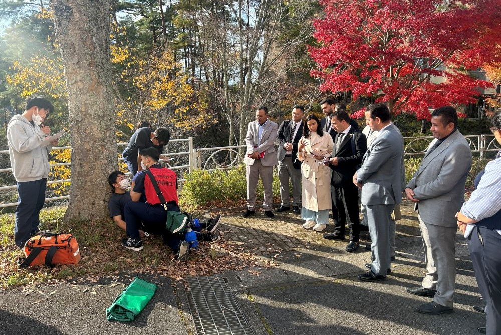 約40日間にわたる本邦研修では、日本の病院前救急医療体制や教育制度について幅広く学ばれており、本学での研修もその重要な一部を担っています。当日は、鶴国際交流推進センター長による歓迎の挨拶に続き、林研究部長から本学の沿革、建学の精神、教学の理念について説明を行いました。その後、救急救命学科2年次科目「救急処置実習A-Ⅱ」の授業見学や、救助訓練棟をはじめとする各実習施設の視察を行いました。