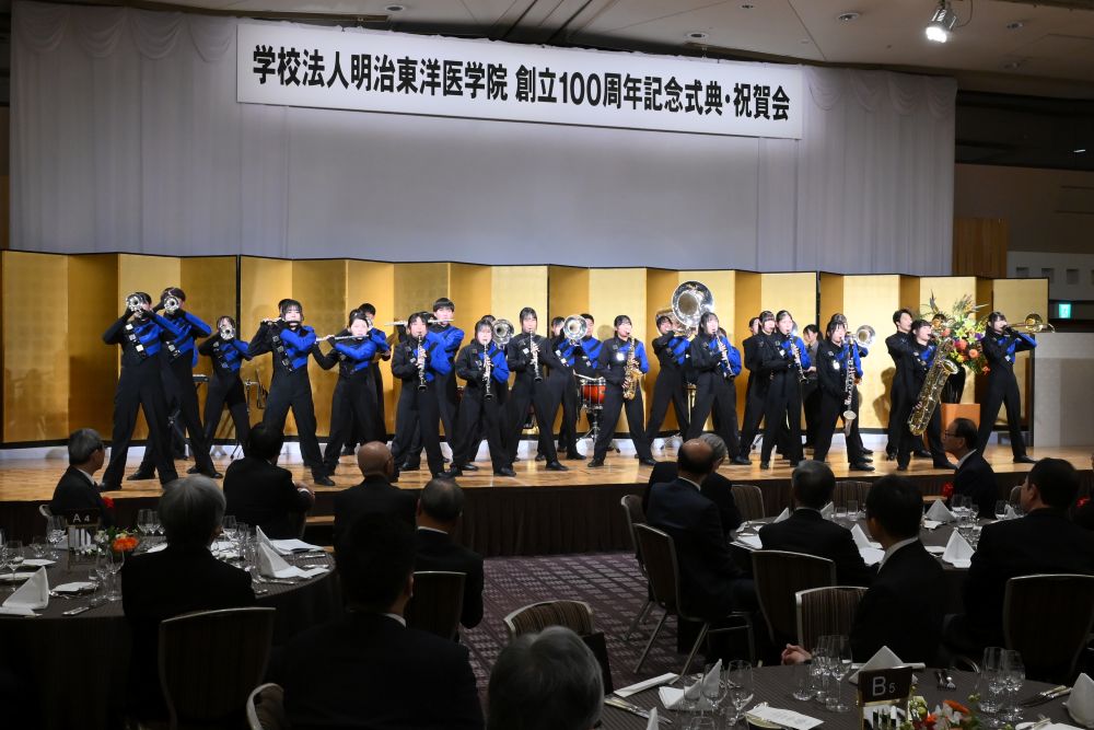 続く祝賀会では、京都明徳高等学校吹奏楽部の皆様による華やかな演奏と出席者による鏡開きで開宴しました。会場では交流が深められるとともに、スライドショーの上映を通じて、学院の100周年の歩みを振り返り、今後への思いを一つにするひとときとなりました。