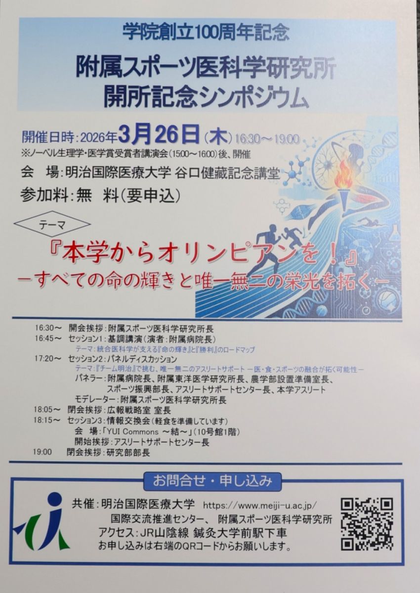 3月26日(木)、明治国際医療大学谷口健藏記念講堂において学院創立100周年記念『附属スポーツ医科学研究所開所記念シンポジウム』を開催します。シンポジウムでは、「本学からオリンピックを!」~すべての命の輝きと唯一無二の栄光を拓く~をテーマに、附属病院長の基調講演のほか、先日のUNIVAS AWARDS 2025-26の安全安心環境構築優秀取組部門で最優秀賞に輝いたアスリートサポートセンター長をはじめ関係各部署の長によるパネルディスカッションなどを実施。女子柔道、女子サッカー、陸上競技をはじめ全国で活躍する強化指定クラブからオリンピアンを目指す取り組みについて議論を深めます。参加は無料。申し込み制となっており、下記チラシのQRコードを読み取りお申込みください。たくさんの方々のご参加を心よりお待ちしております。