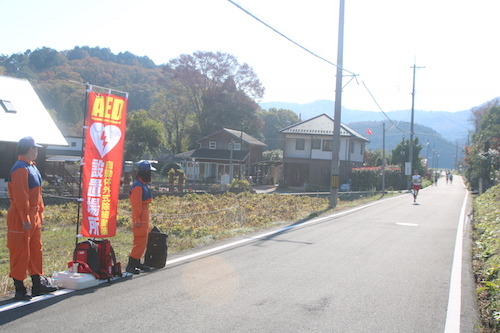 救急救命学科の学生は沿道救護スタッフとして、AEDを装備し、レース中の万が一に備え救護活動を行いました。救急救命学科では日々の授業の中で救護活動を想定した内容を実習に取り組み、AEDを使用した心肺蘇生法をはじめ、すり傷や熱中症等に対応できる「ファ―ストエイド」が実践できる内容を行ってきました。